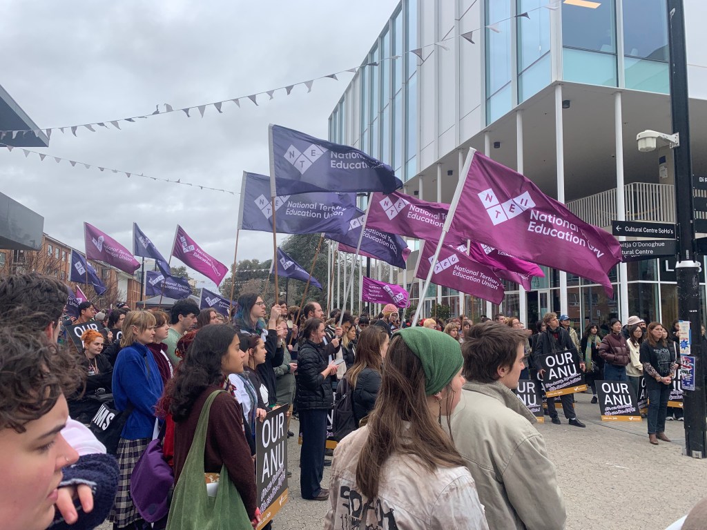 “Since March 2024,1070 jobs have been cut across the university. That’s 1,000 areas of expertise, 1,000 people’s livelihoods. And to be sure, these cuts are happening as a result of Genevieve Bell’s decisions to run our university as a profit machine, rather than fighting to preserve the livelihoods of staff and the quality of our education,” said Pippa Newman, a member of SOS ANU, while addressing the gathered crowd.